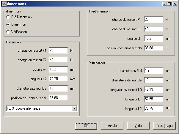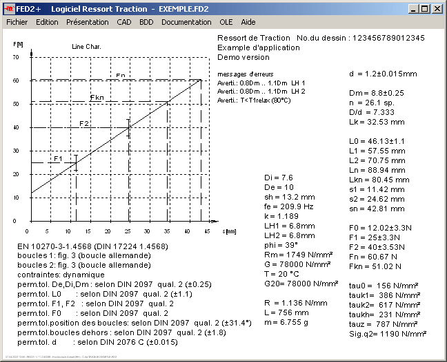 Les Tolérances pour le diamètre du fil de fer d selon EN 10218 et DIN 2077 et pour Dm, L0, F1, F2, F0, la hauteur de la boucle, la position de la boucle selon DIN 2097 et DIN 2096 sont calculées par le programme.