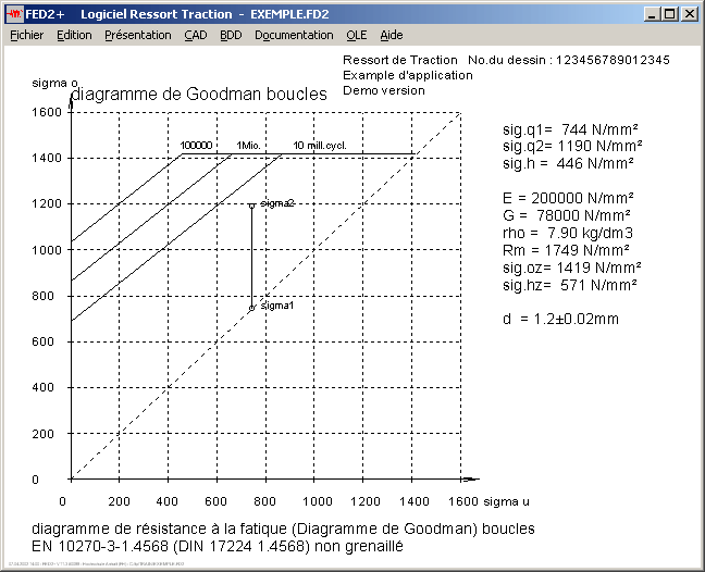 Le domaine de travail du ressort de traction calculé peut être dessiné dans le diagramme des résistances à la fatigue pour un matériau donné. Il est possible de reconnaître chez un ressort dynamique sollicité si la tension d'élévation autorisée est respectée. La courbe de limite de résistance (10Mio.) ainsi que pour 1 Mio. et 100.000alternances de charge sont également dessinés.