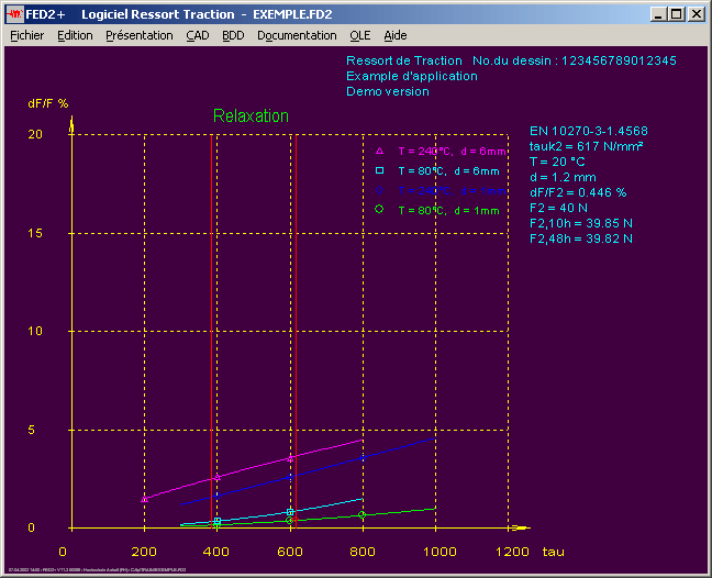 FED2/FED2+ calcule des ressorts de traction selon EN 13906-2. Courbe caractéristique du ressort, diagramme de Goodman et diagramme de température peuvent être représentés graphiquement. Un dessin du ressort à l'échelle ainsi qu'un dessin d'exécution selon DIN/EN peuvent être pris en charge par les jonctions DXF et IGES vers le programme CAD.La version FED2+ contient en plus une banque de données de ressorts qui peut être élargie, un programme de calcul de coût ainsi qu'une animation sur écran.