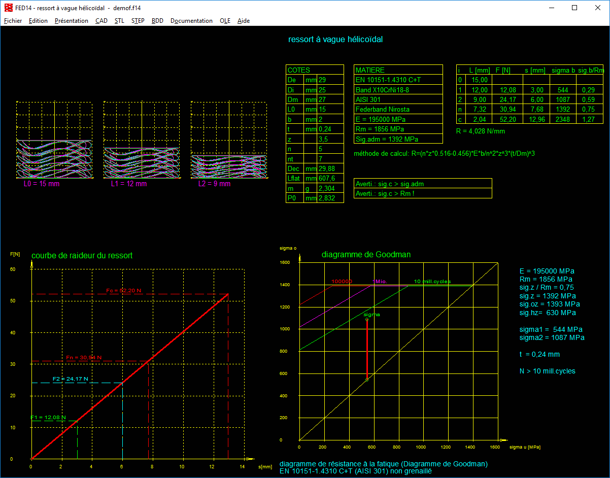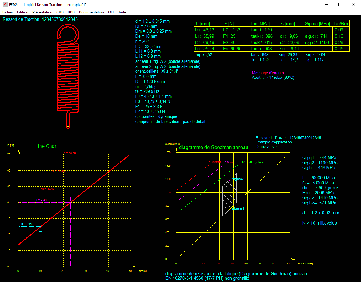 - Visualisation générale des résultats, extrait, caractéristiques progressives de la courbe du ressort, diagramme de Goodmann, cours de la tension, diagramme du taux et du travail du ressort