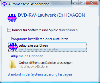 Microsoft betont, daß im neuen Betriebssystem Vista vor allem die Sicherheitsfunktionen verbessert wurde. Das merken Sie sofort, wenn Sie ein neues Programm installieren wollen. "Ein nicht identifiziertes Programm möchte auf den Computer zugreifen" erhalten Sie als Meldung, wenn Sie setup aufrufen. "Zulassen. Das Programm ist vertrauenswürdig.." müssen Sie nun wählen. Das Setup-Programm startet auch nicht mehr automatisch nach Einlegen der CD ("setup.exe ausführen"). Danach läuft alles wie gehabt. Setup ausführen, Programm starten unter "Start > Alle Programme anzeigen > HEXAGON". Unter "Datei > Einstellungen > Grafik" müssen Sie "Dialogfenster Größe" auf 102% einstellen. Sonst werden manche Eingabefenster mit Rollbalken am Rand angezeigt.