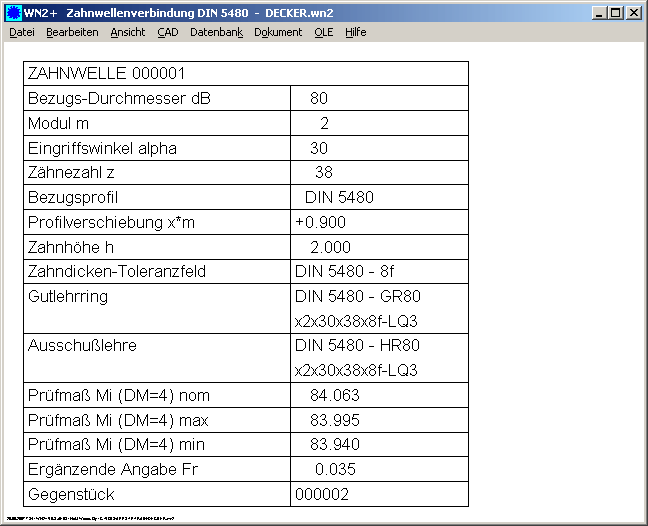 WN10 generiert Profilzeichnungen, Tabellen der Verzahnungsdaten, Fertigungszeichnung. Das Zahnprofil von Welle und Nabe sowie alle anderen Zeichnungen kann man maßstäblich als DXF- oder IGES-Datei in CAD oder CNC-Programme übernehmen.