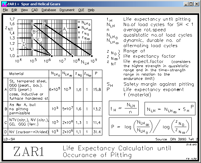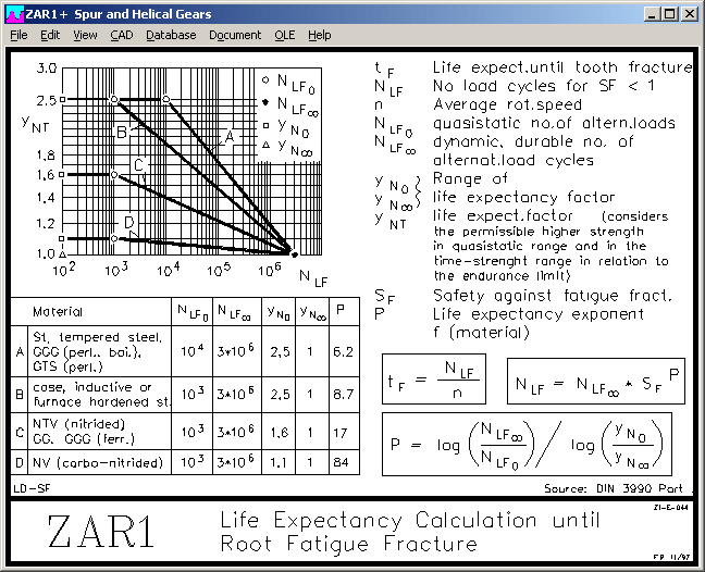 Concerning life time factors YNT and ZNT, calculation method in ZAR1+ and ZAR5 differs from ISO 6336 and DIN 3990. According to DIN and ISO, you have to determine the life time factors YNT and ZNT from the required life time. If life time must be infinite (fatigue life), YNT and ZNT are set 1.0. ZAR1+ and ZAR5 calculate reverse: if calculated safety coefficients SH and SF are higher than 1, gear is fatigue-resistant. If SH and SF are lower than 1, program calculates life expectancy.