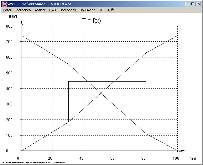 Im Diagramm T = f(x) werden außer der Treppenfunktion mit den konstanten Werten für die Nabenabschnitte zwei Kurven des übertragbaren Drehmoments über der Nabenlänge gezeichnet (beginnend von Nabenanfang und Nabenende).