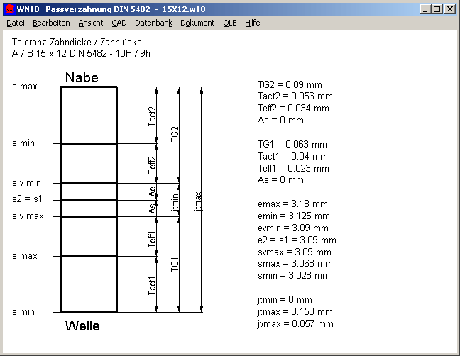 Although DIN 5482 was withdrawn since many years and replaced by DIN 5480, it seems that this old German standard for involute splines is popular and used so far. A new tolerance chart has been added to WN10. Definitions "actual" and "effective" are used in the WN10 tolerance chart, similar than in WN2, WN4 and WN5. Tooth gap tolerances of the internal spline have been added in the printout.