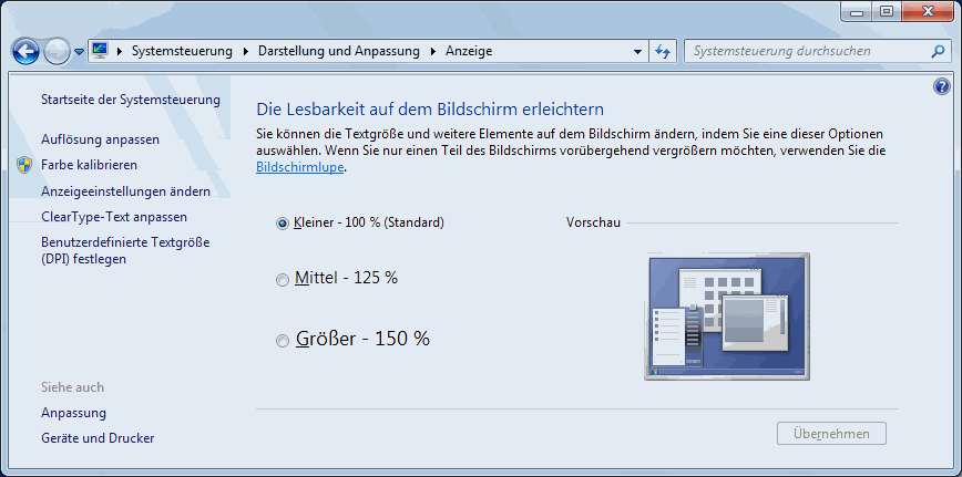 Die Einstellung 150% geht nicht, da passen die Dialogelemente nicht mehr in das Fenster.