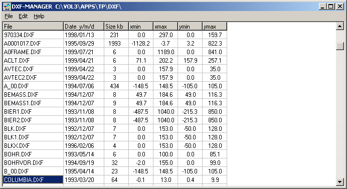 Similar than in the calculation software, HPGL-Manager and DXF-Manager got a preview with table (drawing date and drawing limits). Selected drawings are displayed in the graphic window. If you search for a drawing and do not know the filename, use preview to find it.