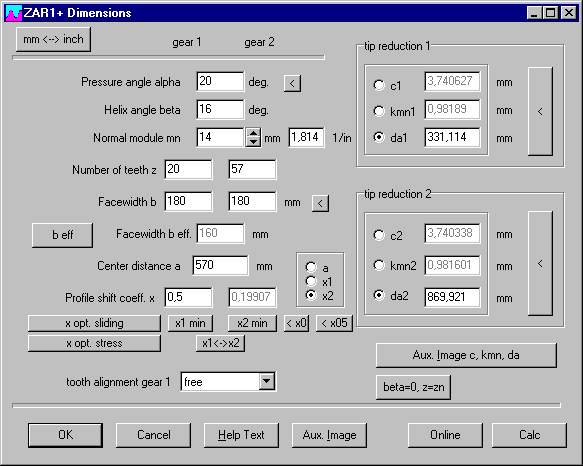 At input of gear pair dimensions you can select which one of the three values center distance, profile shift coefficient x1 or x2 should be calculated. Input has been optimized, selected value is calculated and shown now immediately after input of a, x1 or x2.