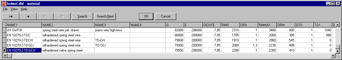 New EN standard defines FD for static load, TD for mean fatigue strength and VD for "difficult dynamic load". TD material types were not included in the fedwst material database as separate material until now. If your spring material database includes "TD" as second name in "Name3" or "Name4" of "VD" material, please clear "TD" at "Database->fedwst.dbf". Tensile strength and permissible shear stress of TD and VD is equal, but fatigue strength of TD is lower than VD.