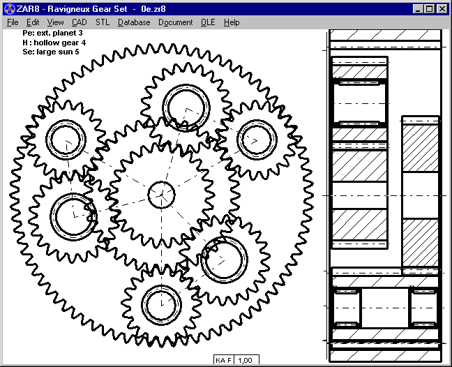 Five gear wheels in two planetary gear sets: Si (small sun wheel), Pi (inner planet wheel), Pe (outer planet wheel), H (hollow wheel), Se (large sun wheel) are calculated by ZAR8 in one pass.