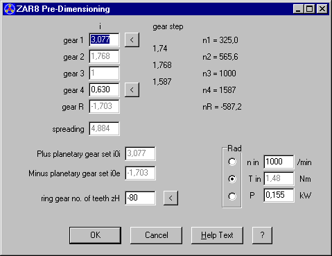 Next enter power or input torque and input speed. You can define number of teeth of the ring gear zH, and ZAR8 calculates dimensions of all gear wheels under consideration of assembly conditions for planetary gear sets.