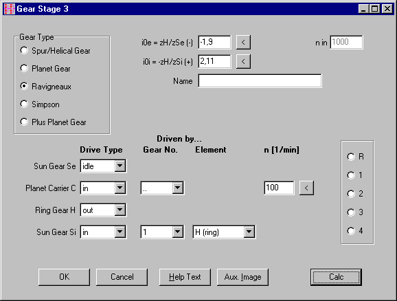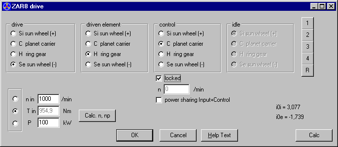 Four connector shafts Si, C, H, Se can be defined as driving (in), driven (out), control or idle. By means of the buttons 1,2,3,4,R you can shift the standard gears of the Ravigneaux gear.
