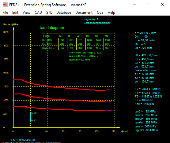 For tension springs, tauzmax = 600 MPa is indicated for hot formed springs according to EN 13906, irrespective of wire or rod diameter. Else, tauz = 0.45 Rm should be used for tension springs according to EN 13906. FED2+ uses the smaller value of 600 MPa and 0.45 Rm. In most cases, 0.45 Rm is larger than 600 MPA, so the permissible shear stress for most hot-formed tension springs is Tauz = 600 MPa.