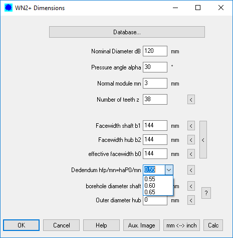 According to DIN 5480, the tooth root height factor hf / mn = 0.55 for broaching, 0.6 for gear hobbing, or 0.65 for gear shaping. The factor can be selected from the list or entered directly.