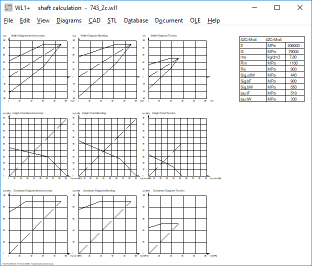 Under View \ Material you can display a table with material data. If fatigue values for the selected material are available or if a material according to DIN 743 has been selected from the database, fatigue strength charts according to Smith, Haigh and Goodman are now also displayed.