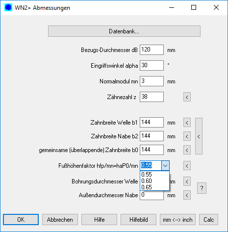 Nach DIN 5480 ist der Zahnfußhöhenfaktor hf/mn = 0.55 bei Räumen, 0.6 bei Wäzfräsen, oder 0.65 bei Wälzstoßen. Der Faktor kann aus der Liste gewählt oder direkt eingegeben werden.