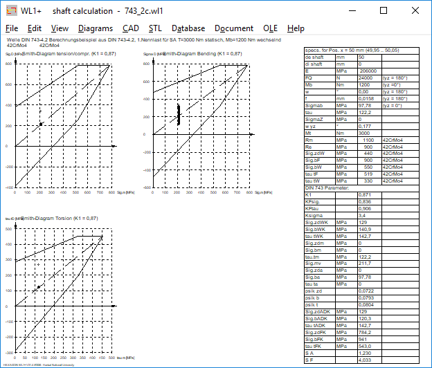 Biegemomente sind dagegen immer wechselnd bei drehenden Wellen, das kann man in WL1+ auch nicht ändern (Umlaufbiegung). Demnach kann man mit dem Wellenberechnungsprogramm WL1+ nur Wellen berechnen, keine Achsen. In DIN 743 gibt es 3 Anwendungsbeispiele. Nur eines davon ist eine drehende Welle mit Umlaufbiegung. Deshalb kann man nur Fall2 (4.2) mit WL1+ nachrechnen. Dafür braucht es 2 Berechnungen: Dauerfestigkeit rechnet man mit Nennlast, Sicherheit Fließgrenze mit Spitzenlast.