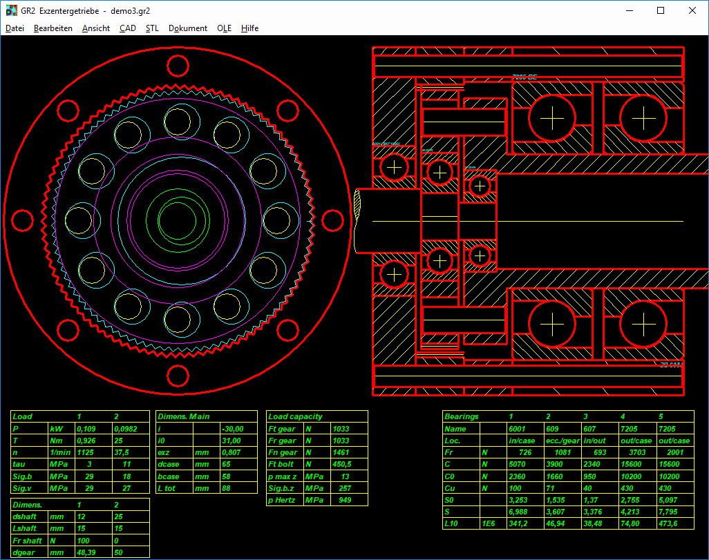 GR2 berechnet Last und Lebensdauer von 5 Wälzlagern (2 für Antriebswelle, 2 für Abtriebswelle, 1 für Planetenrad auf Exzenter).