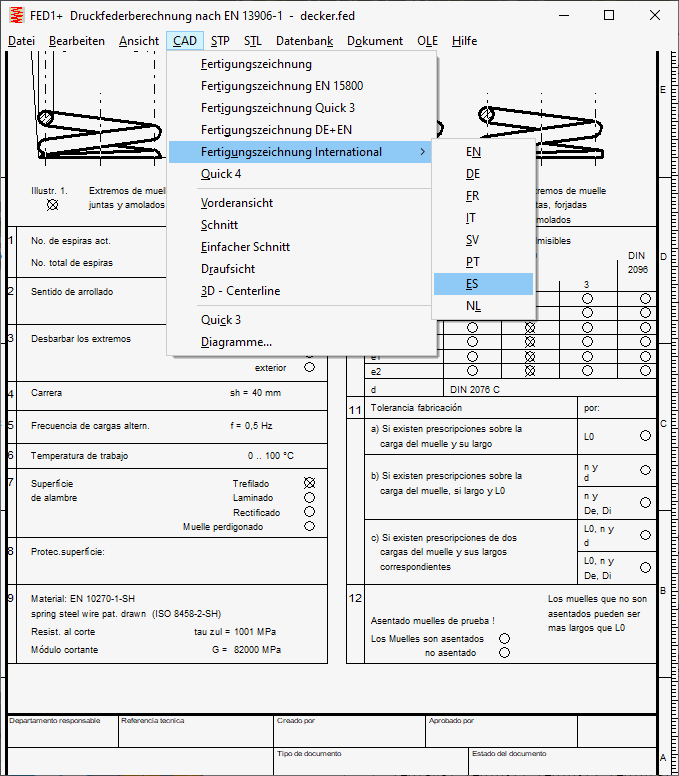 Unter "Ansicht\Fertigungszeichnung International " kann man schon seit 2018 die Fertigungszeichnung in Deutsch, Englisch, Französisch, Italienisch, Spanisch, Portugiesisch, Schwedisch und Holländisch anzeigen und ausdrucken. Diese Funktionen sind jetzt auch im CAD-Menü verfügbar, so daß man internationale Zeichnungen auch als DXF- oder IGES-Datei erzeugen und in CAD übernehmen kann.