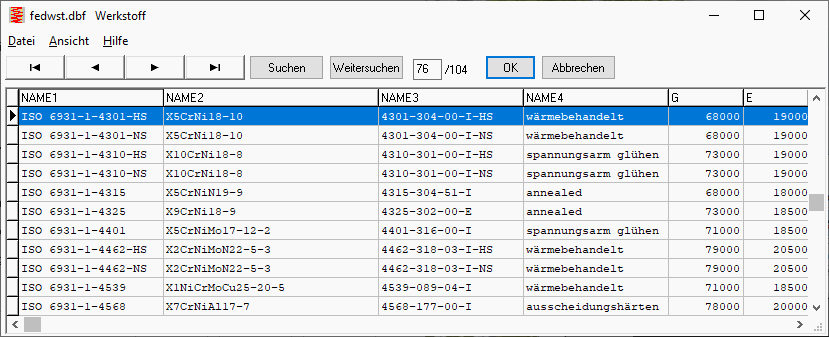 Wenn Sie mit der neuen Version eine alte Berechnungsdatei öffnen, wird als Werkstoffname z.B. "ISO 6931-1-4310-HS" statt "EN 10270-3-4310-HS" angezeigt. Sonst ändert sich nichts, alle Werkstoffkennwerte bleiben gleich.