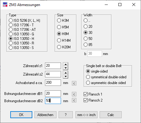 Für Synchronriemen nach ISO 17396:2017 (T und AT), ISO 13050:2016 (G, H, R, S) und ISO 5296:2012 gibt es demnächst eine neue Software ZM3. ISO 5296 mit Zoll-Teilungen (MXL, XXL, XL, L, H, XH, XXH) wurde zurückgezogen, offenbar haben sich die metrischen Abmessungen durchgesetzt.