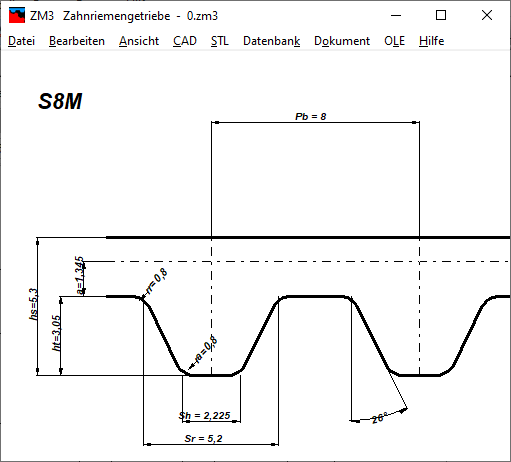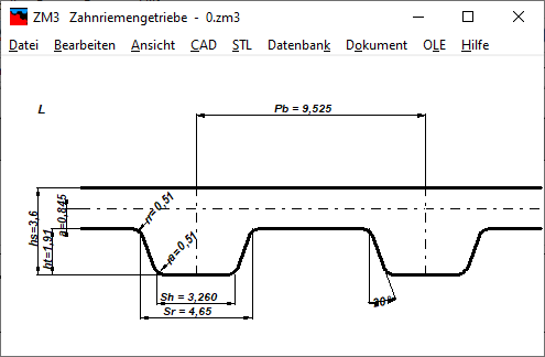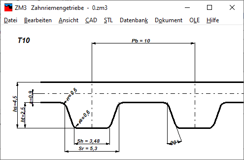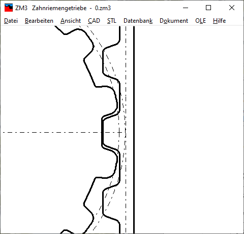 ZM3 generiert auch ein Bild vom Zahneingriff Zahnriemen mit Riemenscheibe. Beim T-Profil fällt auf, dass das Flankenspiel sehr groß ist. Für Antriebe mit Drehrichtungsumkehr ist das T-Profil so nicht zu gebrauchen, außer man verändert das Zahnprofil der Riemenscheiben.