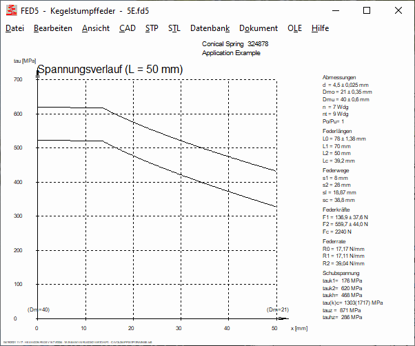 In FED5, FED6 und FED7 kann man den Verlauf der Spannung entlang des Federkörpers als Diagramm anzeigen, und das für jede Federlänge zwischen L0 und Lc. Die x-Achse ist dann der Federkörper von 0 bis angegebene Federlänge. Was welcher Seite entspricht wurde nicht angezeigt, weshalb eine mit FED7 näherungsweise berechnete Kegelfeder seitenverkehrt dargestellt wurde im Vergleich zu der mit FED5 berechneten Feder. Deshalb wurde das tau-x Diagramm in FED5 umgedreht, außerdem wird in Klammern der mittlere Windungsdurchmesser der Federenden angegeben.