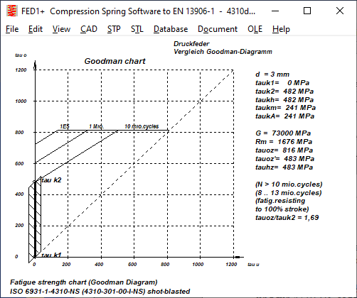 1.4310: In the case of spring steel wire 1.4310, it is not mentioned whether the type 1.4310-NS or 1.4310-HS was examined. Because the allowable shear stress (upper horizontal) in the Goodman diagram is so low, it can only be NS. For d=3mm one can read tauzul= 770 MPa. However, the permissible shear stress (tauzul=0.56Rm) at d=3mm is for ISO 6931-1-4310-NS = 868 .. 1002 MPa,