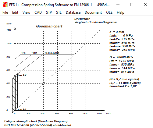 The comparison of the fatigue strength diagram for 10 million load cycles and the fatigue strength diagram for 1 million load cycles according to IGF differs significantly from the Goodman diagrams from EN 13906. While the permissible stress amplitude according to EN 13906-1 for 1E6 load cycles was approx. 25% higher than for 1E7, according to the new Goodman diagrams it is only between 10 and 15%. Conversely, for the calculation of the number of load cycles and service life, this means that these become significantly lower if the permissible fatigue variation of stress is exceeded. It is therefore planned to add a field 1E6_1E7 to the spring material database fedwst.dbf, in which the quotient tauhzul,1E6 / tauhzul,1E7 can be entered.