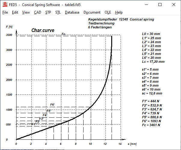 Similar to FED1+, you can now also enter additional spring lengths in FED5 and FED6 and FED7, for which the spring force is drawn in an additional spring characteristic curve (View\Spring characteristic\F'-s').