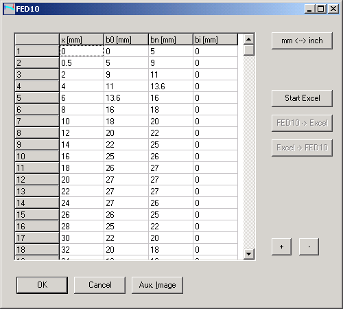 Die Abschnitte einer Blattfeder können nun alternativ als Tabelle im Programm oder mit MS-Excel eingegeben werden. Das ist sinnvoll bei komplizierten Formen, oder wenn die Kontur durch eine mathematische Formel beschrieben wird.