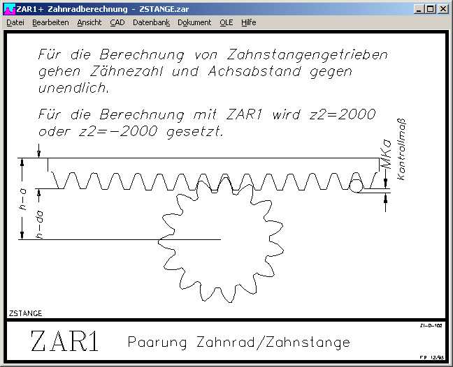 Unter "Sonderabmessungen->Zahnstange-Ritzel" kann man jetzt die Höhe der Zahnstange (vom Rücken der Zahnstange bis Kopflinie) eingeben. ZAR1+ gibt dann im Ausdruck den Abstand vom Zahnrücken zur Ritzelachse (h-a) mit aus (h-a = a - da2 / 2 + h-da).
