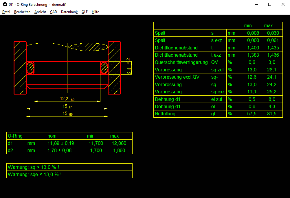 Die Ergebnisse werden auf minimal und maximal zulässige Werte von Verpressung, Dehnung, Stauchung, Nutfüllung überprüft. Bei Über- und Unterschreitung werden Fehlermeldungen ausgegeben.