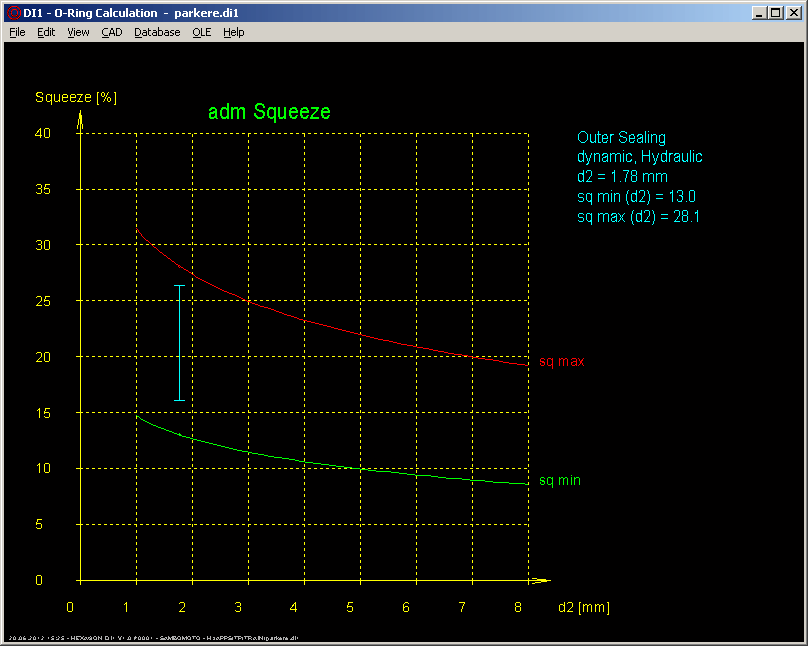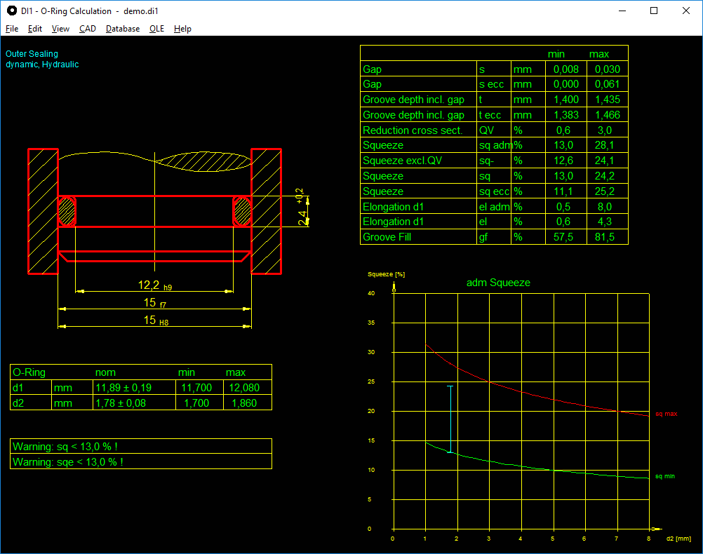 DI1 calculates squeeze of the o-ring under consideration of tolerances, reduction of cross section, concentric and eccentric position.
