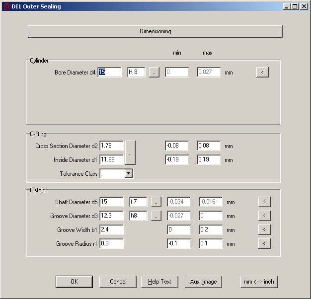 For Recalculation, enter all dimensions and tolerances, and DI1 calculates squeeze and strain. You can also calculate non-standard o-ring seals.