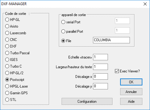 En sortant des dessins sur imprimantes laser Postscript, vous pouvez choisir le font et la taille du texte. Vous pouvez classer différentes couleurs et épaisseurs de trait.