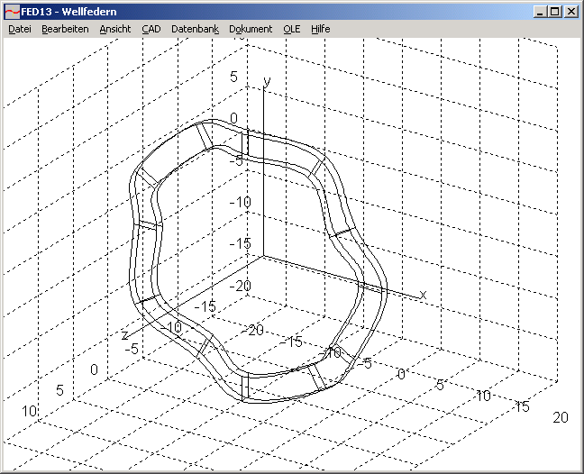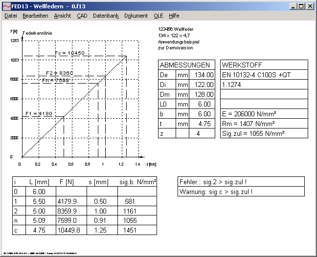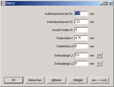 Aus den Abmessungen von ringförmigen Federn mit sinusförmigen Wellen berechnet das Programm Federkennlinie und Biegespannung für axiale Belastung. Eingabedaten sind Außen- und Innendurchmesser, Blechdicke, Anzahl der Wellen, Höhe der Wellfeder L0. Für die Einbau- bzw. Arbeitslängen L1 und L2 werden Federkräfte und Spannungen berechnet. Der Werkstoff wird aus der integrierten Datenbank gewählt.