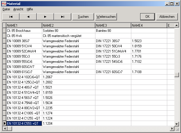 Die Kennwerte der wichtigsten Federwerkstoffe (Zugfestigkeit, zul. Schub- und Biegespannung in Abhängigkeit von Materialdicke, Schubmodul, E-Modul, Dichte) holt FED13 aus der integrierten Datenbank. Die DBF-Datei kann vom Anwender modifiziert und erweitert werden.