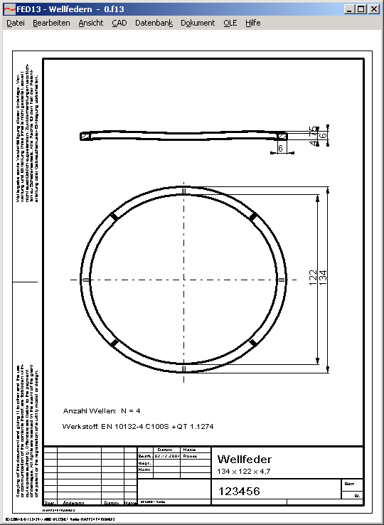 Eine komplette Fertigungszeichnung der Wellfeder mit allen Abmessungen wird von FED13 erzeugt. Zeichnungsinformationen und Änderungsindex kann man im Programm eingeben.
