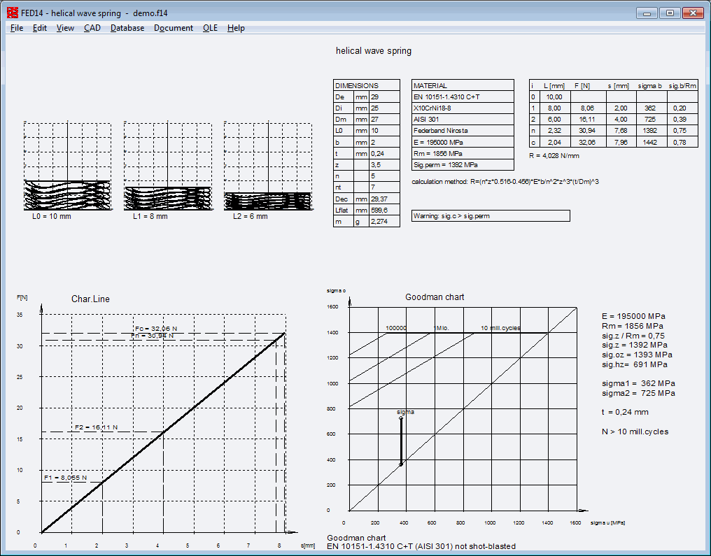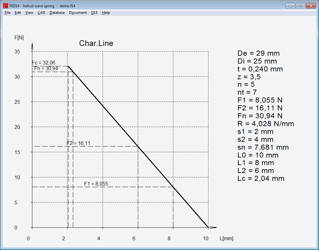 FED14 calculates characteristic line of spring (load-deflection diagram) as function of spring travel and spring length.