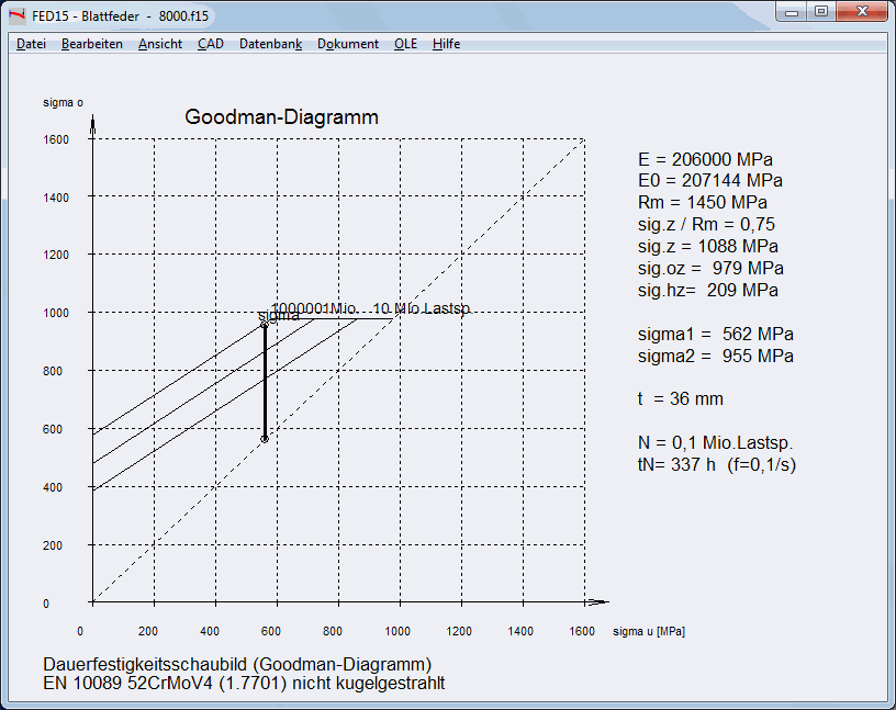 Bei dynamischer Beanspruchung kann man anhand des Goodman-Diagramms die Dauerfestigkeit der Feder beurteilen und die Lastspielzahl berechnen. Die Parameter für Dauerfestigkeitsschaubilder werden aus der Werkstoffdatenbank übernommen.