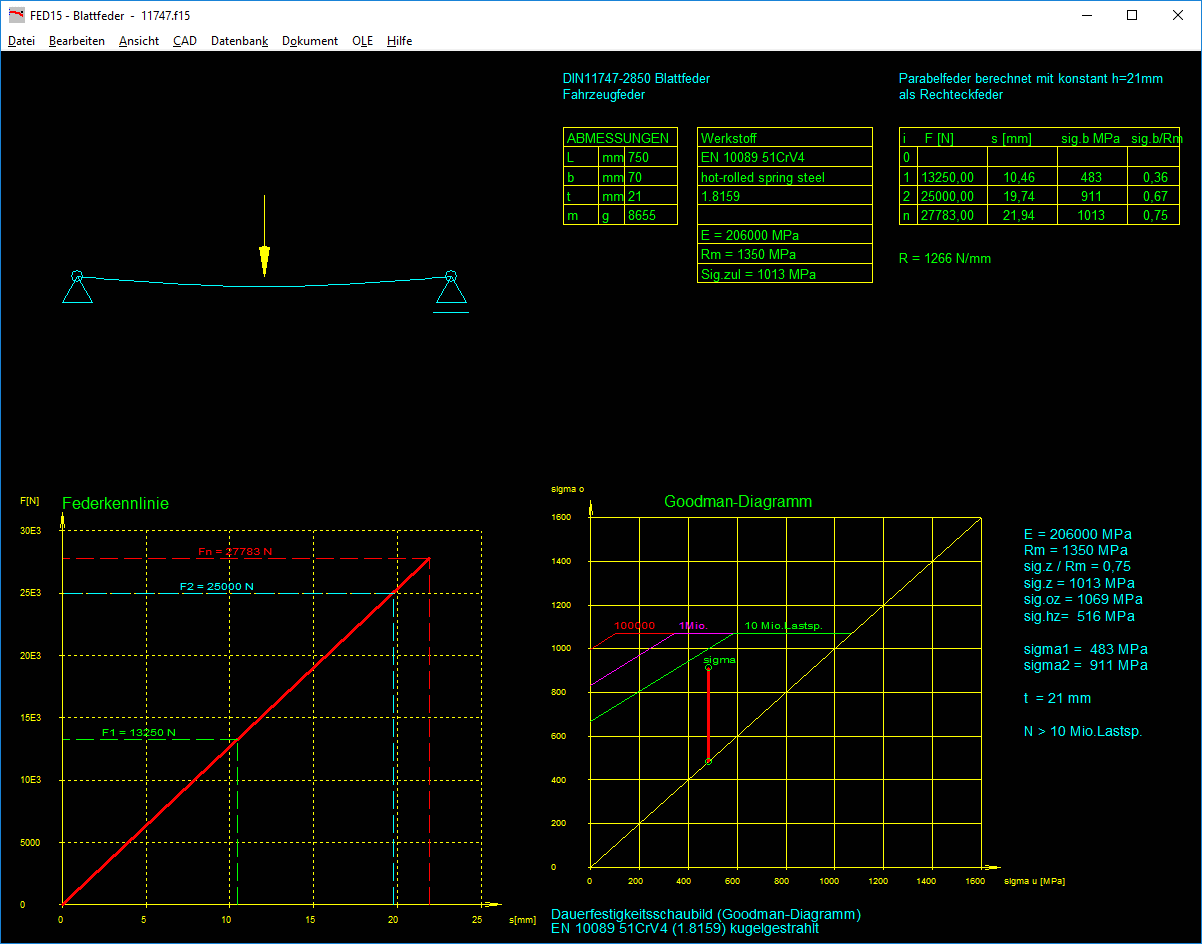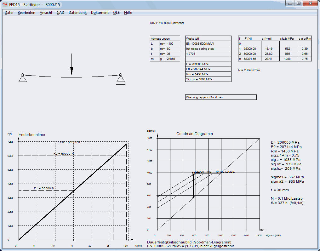 F r komplexe Blattfederabmessungen, komplexe Lagerung, und komplexe Belastung durch L ngs- und Querkr fte, Biegemomente und Fl chenlasten, haben wir eine andere Software: FED10.