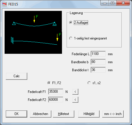 Aus den Abmessungen berechnet das Programm Federkennlinie und Biegespannung. Eingabedaten sind Federlänge, Federbanddicke und Federbandbreite. Dazu kann man entweder zwei Federkräfte F1 und F2 vorgeben und die Federwege berechnen lassen, oder die Federwege s1 und s2 vorgeben und die Federkräfte berechnen lassen.