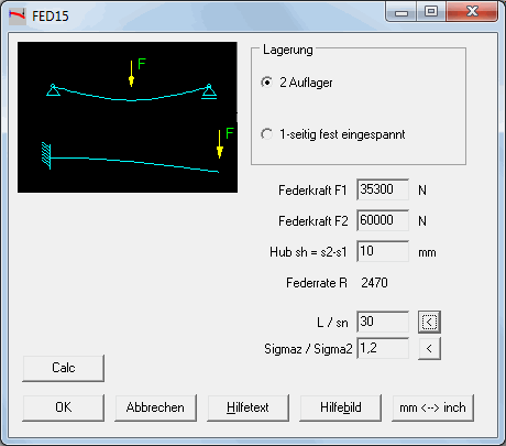 In der Vorauslegung muß man nur 2 Federkräfte und einen Hub, oder eine Federkraft und einen Federweg eingeben, und FED15 berechnet die Abmessungen der Blattfeder. Hierbei kann man die Parameter Federlänge/Federweg und Sicherheit Sigmaz/Sigma2 nach Bedarf verändern.