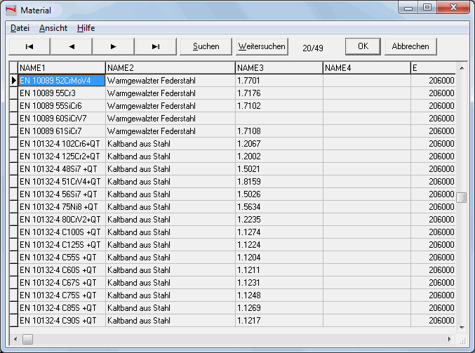Die Kennwerte der wichtigsten Federwerkstoffe (Zugfestigkeit, zul. Schub- und Biegespannung in Abhängigkeit von Materialdicke, Schubmodul, E-Modul, Dichte) holt FED15 aus der integrierten Datenbank. Die DBF-Datei kann vom Anwender modifiziert und erweitert werden.