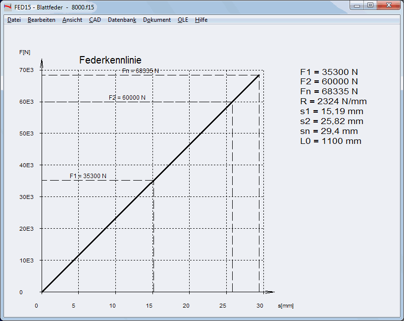 FED15 berechnet die Federkennline (Kraft-Weg-Diagramm). Die Diagramme können Sie ausdrucken oder als DXF- Datei bzw. über Zwischenablage in Ihre Dokumentation übernehmen.