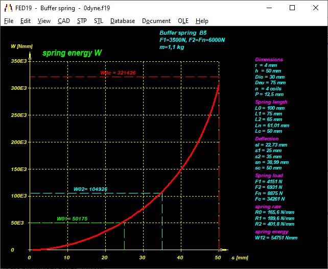 FED19 displays diagrams of the spring load -deflection characteristic curve, spring rate and spring energy. The diagrams can be printed out or transferred to CAD or documentation via the DXF and IGES interface.