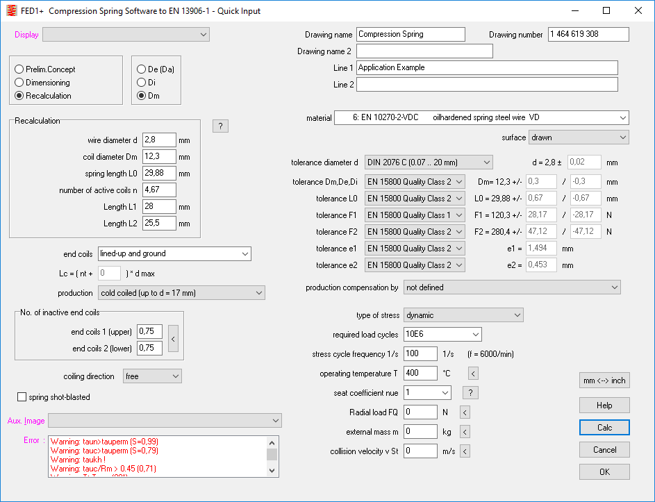 The program calculates the tolerances for the wire diameter d according to EN 10218 and DIN 2077, and for Dm, L0, F1 and F2 according to EN 15800 and DIN 2096.