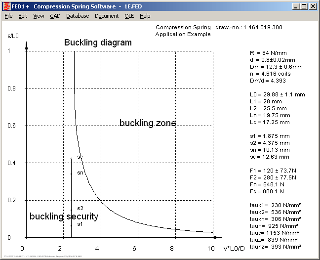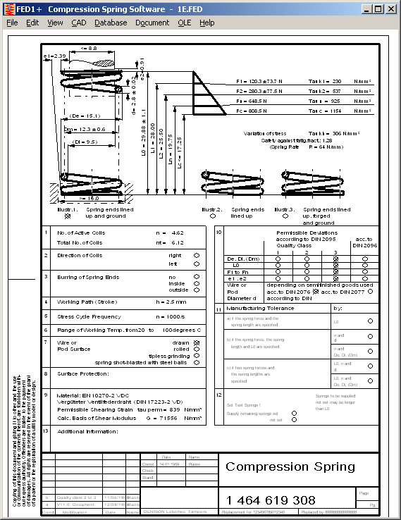 FED1+ calculates cylindrical helical compression springs in accordance with EN 13906-1. Graphical presentation of the spring's characteristic curve, the Goodman diagram and the buckling field is possible. A scale drawing of the spring, as well as a production drawing in accordance with DIN/EN can be exported to CAD via the DXF and IGES interfaces. The extended version, FED1+, also contains a