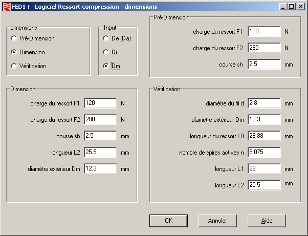 Lors de la conception, l'entrée des valeurs des forces du ressort, du diamètre entre les spires et de la longueur totale permet de calculer le ressort de compression correspondant. Pendant la vérification du calcul, les ressorts déjà existant sont vérifiés à partir des dimensions qui ont été entrées. Sont calculés tous les travaux de ressorts, forces de ressort, hauteur de compression de ressort, raideur de ressort, tensions, longueurs de fil, endroits d'inflexion, élasticité transversale du ressort, fréquence propre, poids. Il est également possible de calculer itérativement les forces minimales et maximales F1 et F2 pour obtenir le ressort le plus souple et le plus dur, ainsi que le diamètre de fil de fer le plus grand et le plus petit.